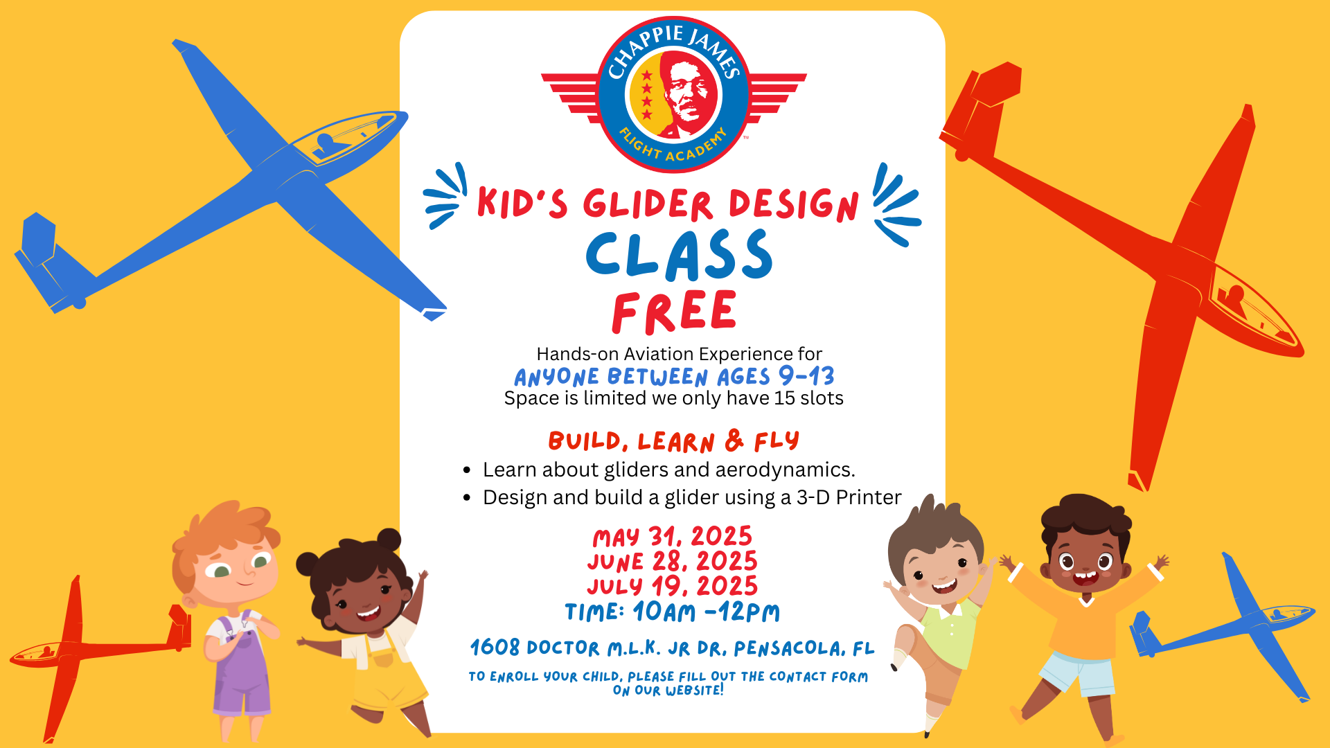 The General Daniel Chappie James Flight Academy is offering a fun and exciting Kid’s Glider Design Class for boys and girls ages 9–13.